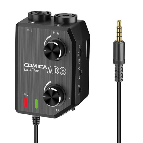 LinkFlex AD3 XLR da Comica é uma interface portátil de microfone / instrumento para gravar áudio de qualidade profissional. A LinkFlex AD3 facilita a gravação, conectando microfones e instrumentos ao smartphone, tablet, câmera DSLR ou câmera de vídeo. Com dois canais independentes, permite conectar e controlar o ganho em vários microfones ou instrumentos ao mesmo tempo.A interface também possui três tipos de entradas para acomodar qualquer configuração: duas entradas combinadas XLR / 1/4 “e duas entradas de 1/8” para conectar qualquer instrumento ou microfone. Permite alternar entre os modos de saída mono e estéreo, conforme necessário. O LinkFlex AD3 também possui monitoramento duplo, o que permite a dois usuários monitorar simultaneamente o áudio de saída diretamente das saídas de 3,5 mm.
