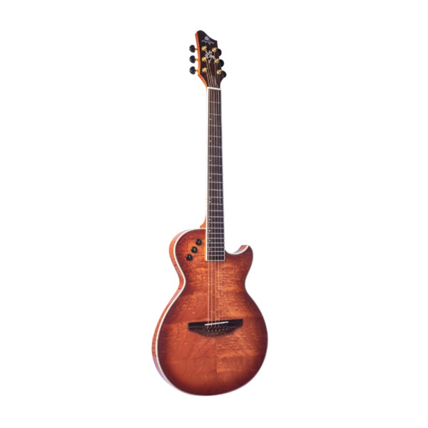 Diferencial: Visual mahogany tigrado sofisticado + corpo anatômico leve + pré-amplificador ativo integrado